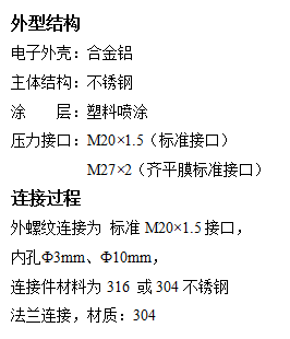 Ø 测量介质:对316L无腐蚀的各种气体液体等 测量形式:绝压(A)、相对压(G) 工作温度:-40~65℃ 补偿温度:-10~70℃ 温漂系数:±0.01%FS/℃、±0.005%FS/℃ 综合精度:0.1、0.2、0.5级 稳 定 性:小于0.2%FS/年、0.5%FS/年 过 载:1.5倍FS 电源电压:24VDC 输出选择:两线制4~20mA, 0~10mA, 0~-5V, 1~5V 防护等级:IP65